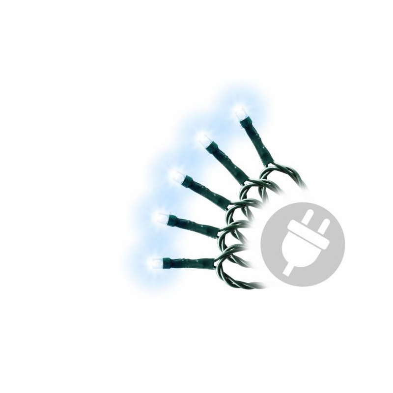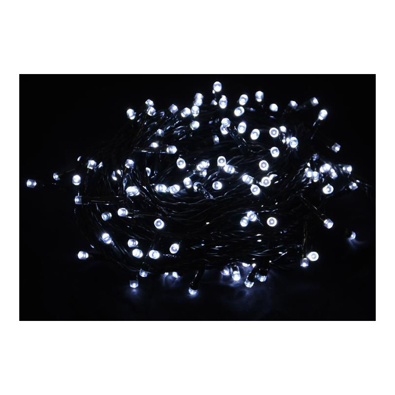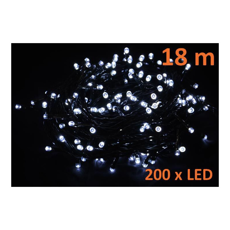 Vodotěsný vánoční řetěz vhodný do vnitřního i venkovního prostředí. Provedení s délkou světelné části 18 m a celkovým počtem 200 LED diod. Řětěz vydává studeně bílé světlo, barva kabelu je tmavě zelená.