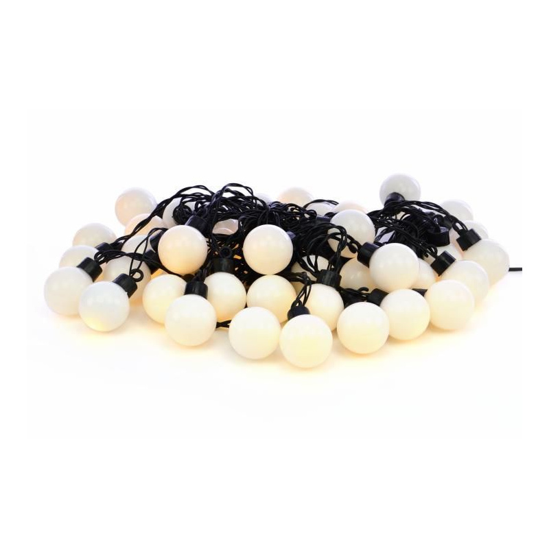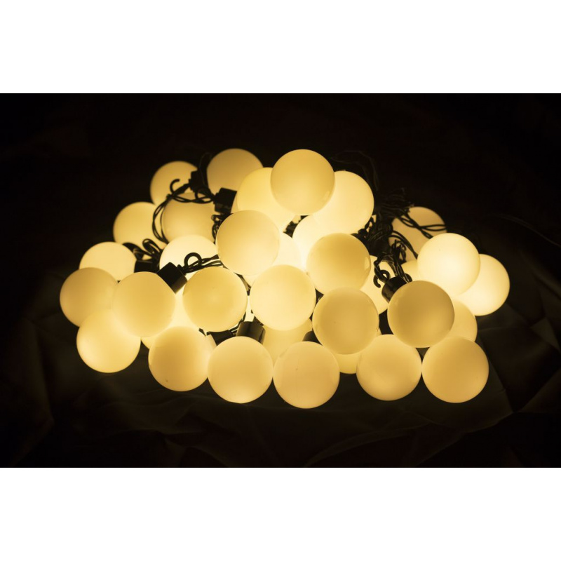 Svítící dekorativní řetěz z bílých koulí o průměru 40 mm s celkovou délkou 22 m (světelná délka 12 m, napájecí kabel 10 m). Napájení ... Více v detailním popisu níže.