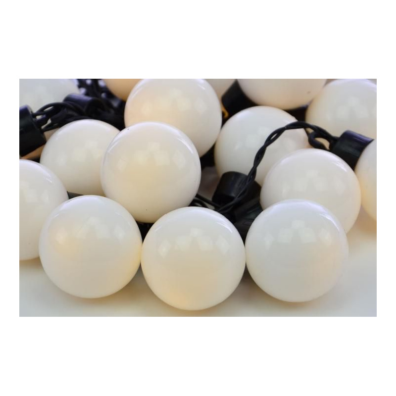Svítící dekorativní řetěz z bílých koulí o průměru 40 mm s celkovou délkou 22 m (světelná délka 12 m, napájecí kabel 10 m).