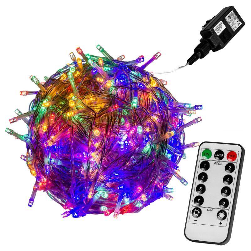 Pestrobarevný vánoční světelný řetěz využívající namísto klasických žárovek moderní úsporné LED diody. Tento typ řetězu má celkem 8 světelných funkcí – kromě trvalého svícení nejrůznější druhy blikání včetně časovače, který jej může pravidelně zapínat a vypínat. Řetěz má transparentní (průhledný) kabel, je voděodolný (vhodný pro vnitřní i venkovní použití) a délka jeho světelné části je 10 m (napájecí kabel má délku 5 m).