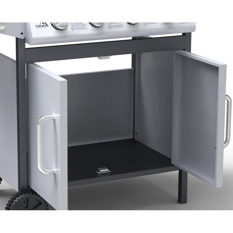 Moderní plynový zahradní gril s velkým uzavřeným úložným prostorem, boční plotnou a praktickým skládacím stolkem.