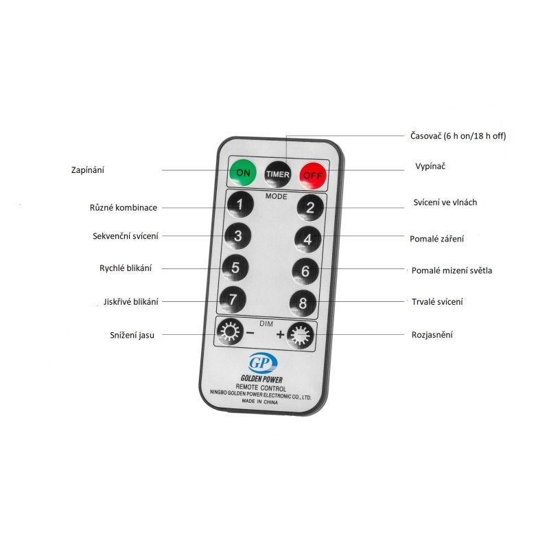 Tento svítící závěs má celkem 8 různých světelných funkcí, které může přepínat jednoduchým stiskem tlačítka na krabičce s bateriemi, nebo prostřednictvím dálkového ovladače- umožňuje jak trvalé svícení, tak různé typy blikání- svícení ve vlnách, sekvenční svícení, pomalá záře, rychlé blikání, pomalé slábnutí, jiskřivé blikání, kombinace efektů.