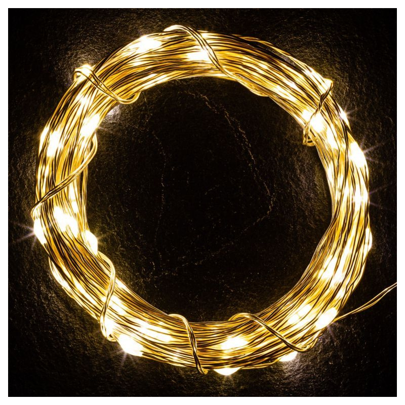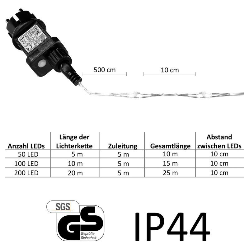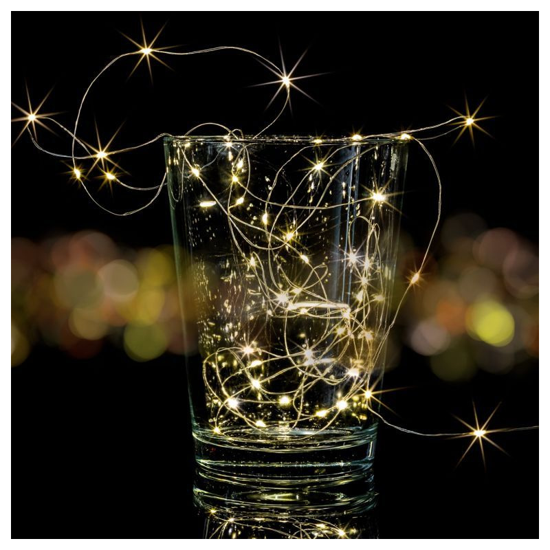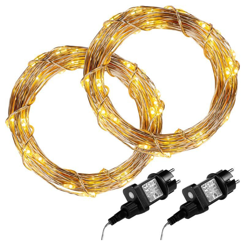 Sada 2 kusů vánočních světelných řetězů s malými LED diodami na tenkém stříbrném drátku, které působí jemným a elegantním dojmem. Osvětlení je voděodolné (krytí IP44), takže je možno jej používat ve vnitřních i venkovních prostorech. Napájení je skrze adaptér z klasické elektrické zásuvky 230V. 2x100 LED diod svítících teple bílou barvou. Délka světelné části 10 m (plus 5 m napájecí kabel).