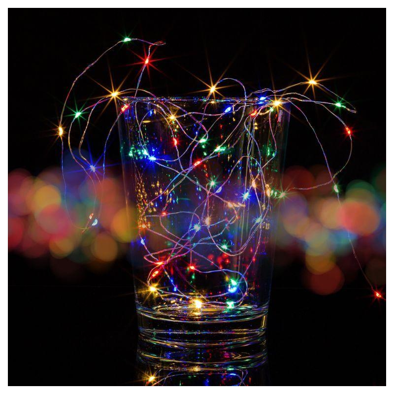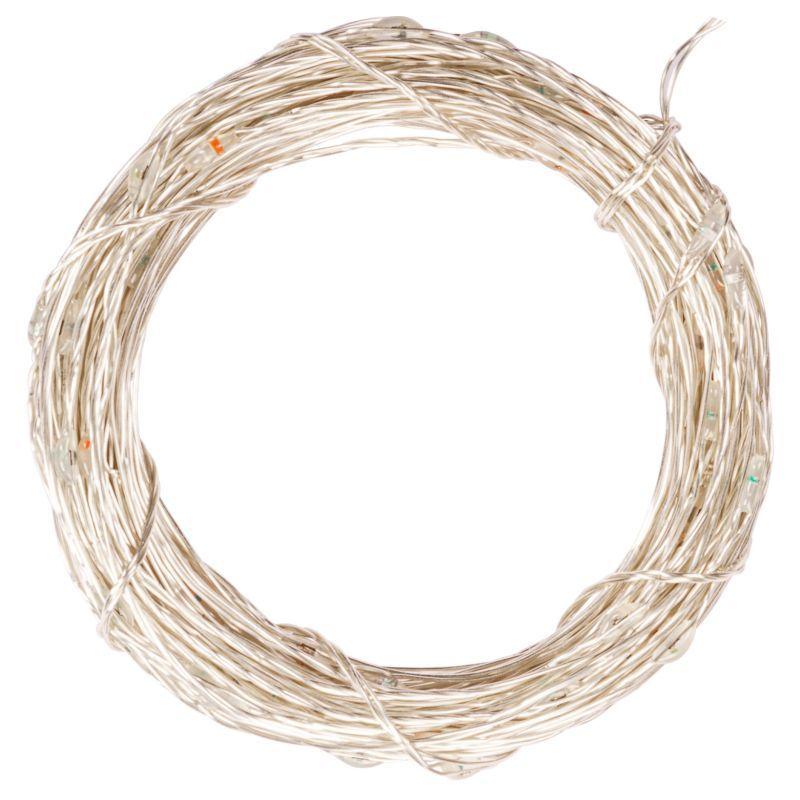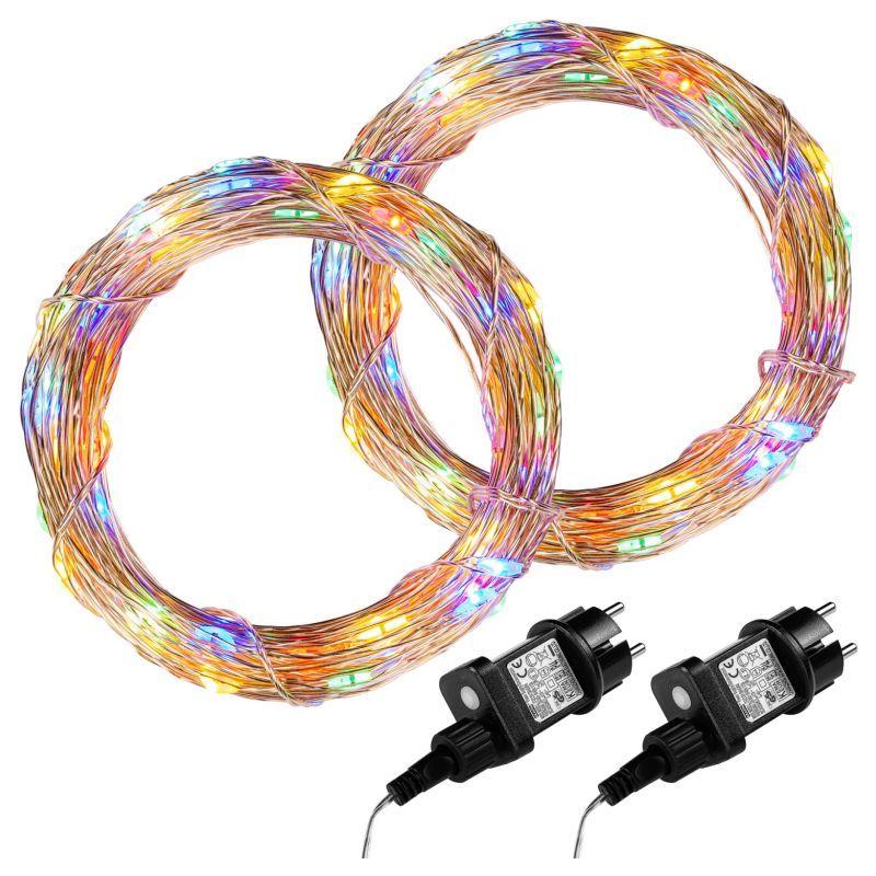 Sada 2 kusů vánočních světelných řetězů s malými LED diodami na tenkém stříbrném drátku, které působí jemným a elegantním dojmem. Osvětlení je voděodolné (krytí IP44), takže je možno jej používat ve vnitřních i venkovních prostorech. Napájení je skrze adaptér z klasické elektrické zásuvky 230V. 2x200 LED diod různé barvy. Délka světelné části 20 m (plus 5 m napájecí kabel).