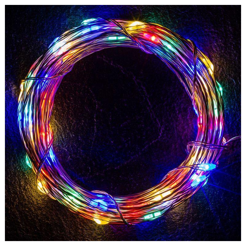 Sada 2 kusů vánočních řetězů s malými LED diodami na tenkém stříbrném drátku, které působí jemným a elegantním dojmem. Osvětlení je voděodolné (krytí IP44), takže je možno jej používat ve vnitřních i venkovních prostorech. Napájení je skrze adaptér z klasické elektrické zásuvky 230V. 2x50 pestrobarevných LED diod. Délka světelné části 5 m (plus 5 m napájecí kabel).
