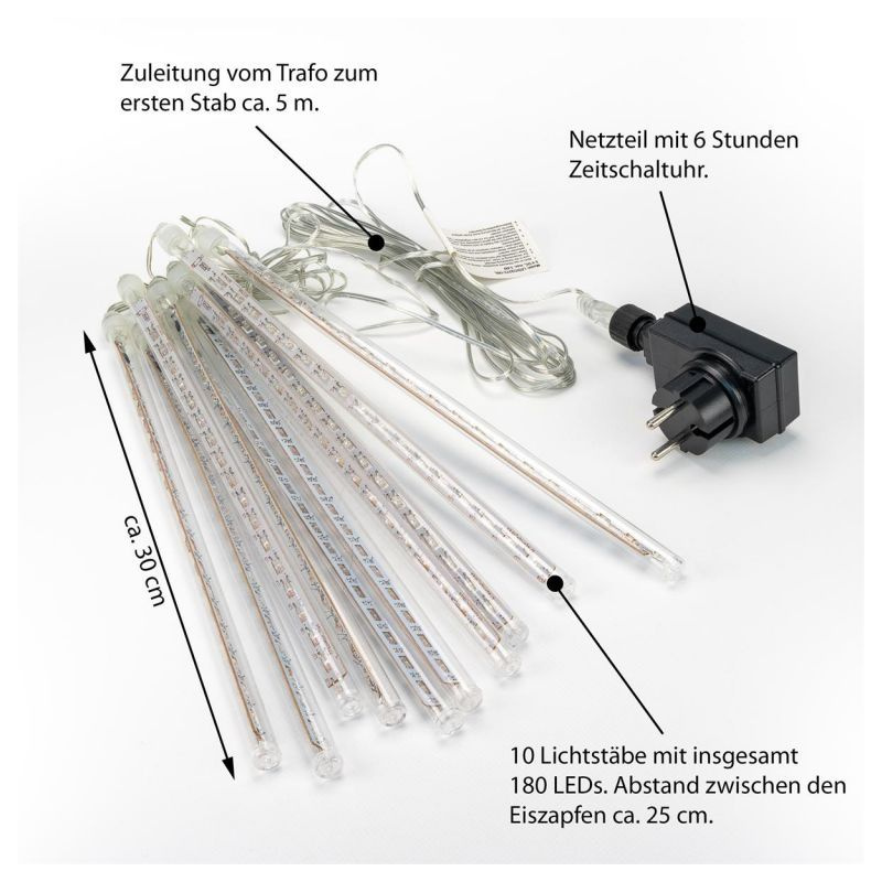 Nevšední svítící vánoční řetěz tvořený 10 tyčemi s celkem 180 barevnými LED diodami. Celková délka je cca 7,5 m (z toho 2,5 m světelná část a 5 m napájecí kabel). Napájení z klasické elektrické zásuvky 230 V. Osvětlení je voděodolné a tudíž vhodné pro venkovní i vnitřní použití.