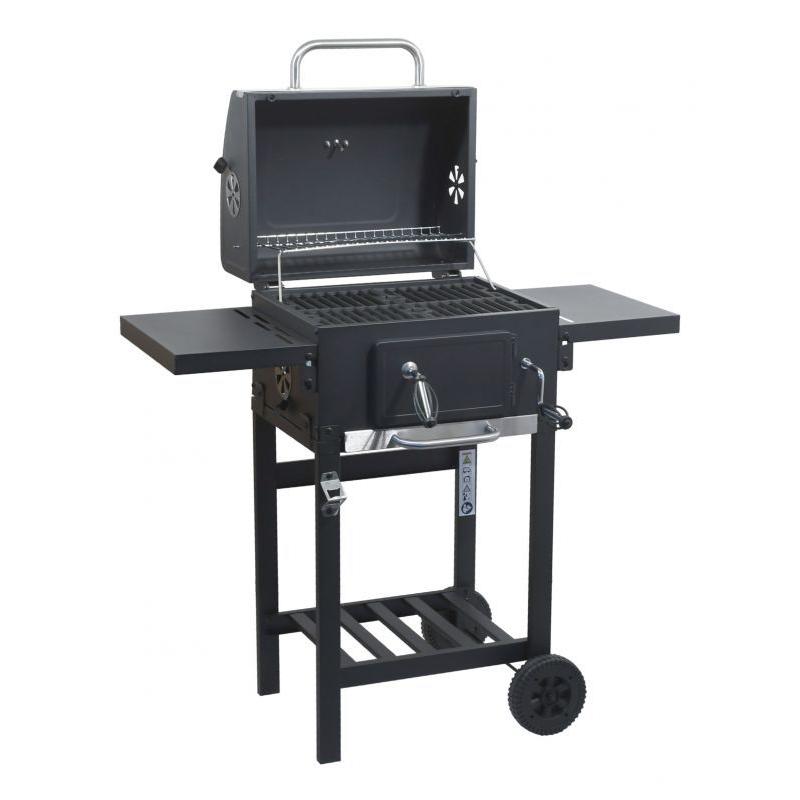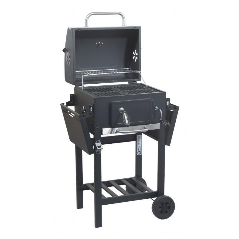 Zahradní gril s víkem a litinovým roštem v kvalitním bytelném provedení s kolečky, sklápěcími odkládacími poličkami, otevíracím víkem a topeništěm s otevíracími dvířky.