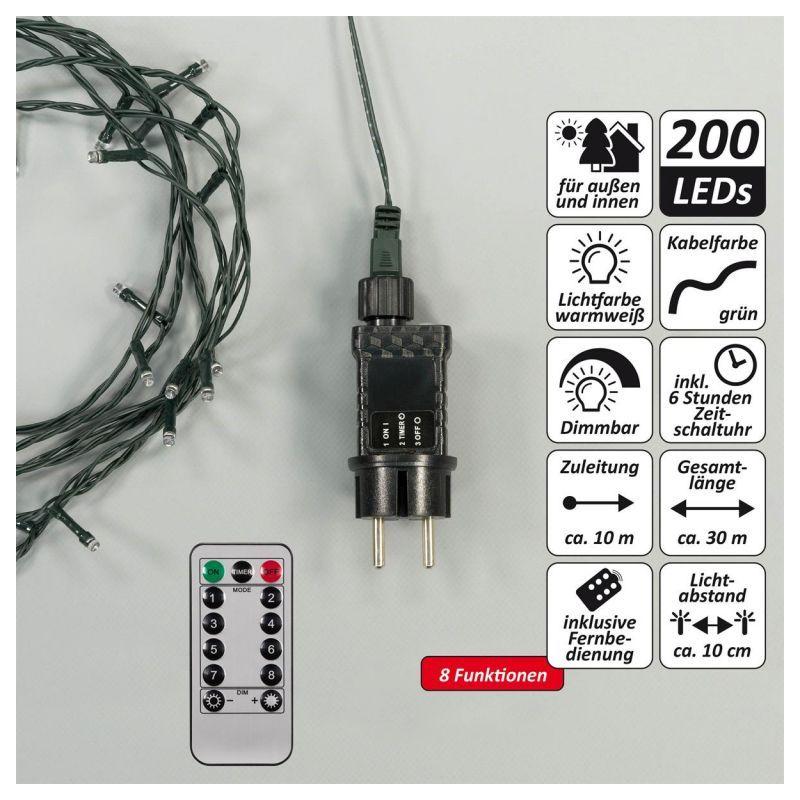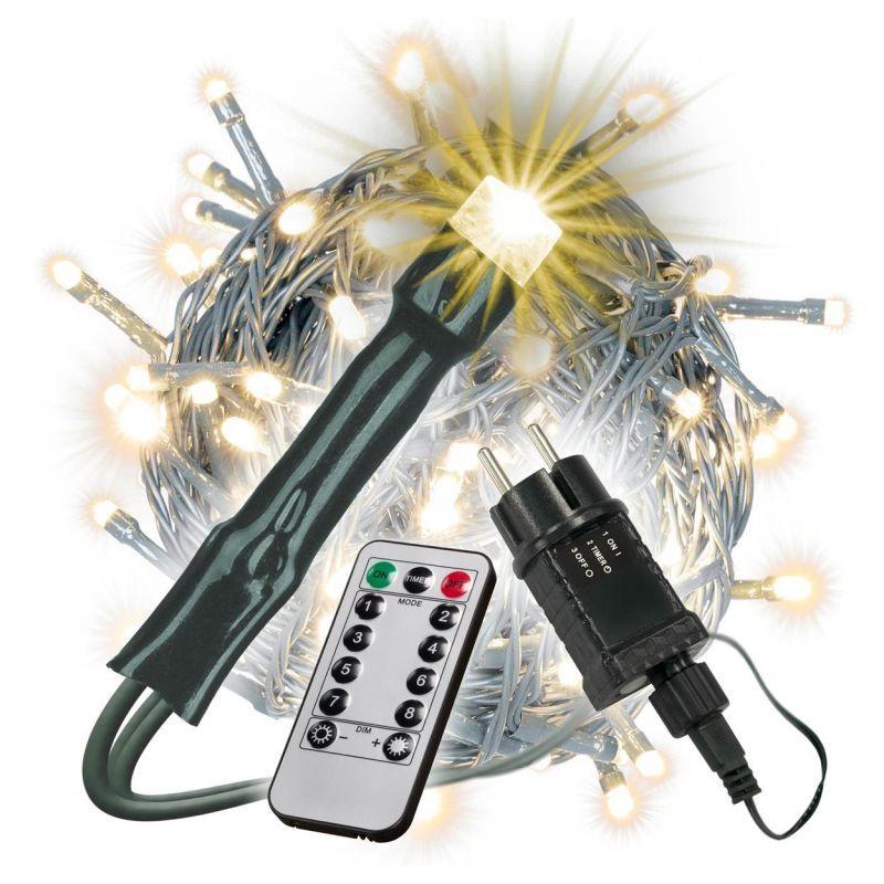 Vánoční světelný řetěz využívající namísto klasických žárovek moderní úsporné LED diody. Tento typ řetězu má celkem 8 světelných funkcí- kromě trvalého svícení nejrůznější druhy blikání včetně časovače, který jej může pravidelně zapínat a vypínat. Řetěz má zelený kabel, je voděodolný (vhodný pro vnitřní i venkovní použití) a délka jeho světelné části je 20 m (napájecí kabel má délku 10 m).