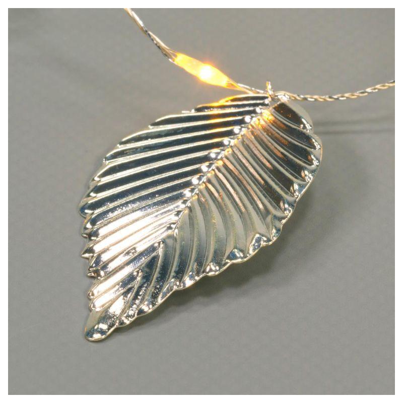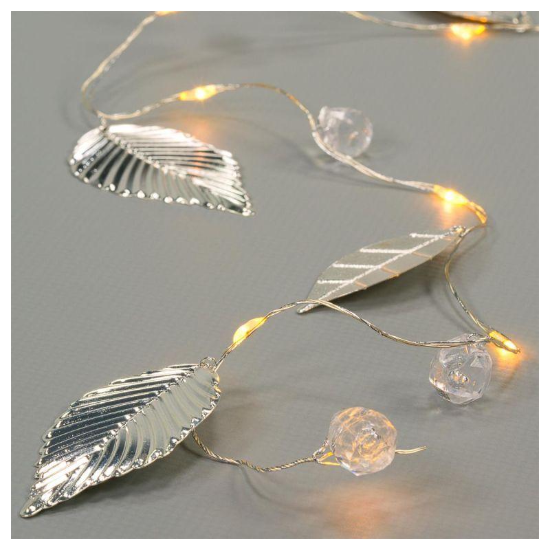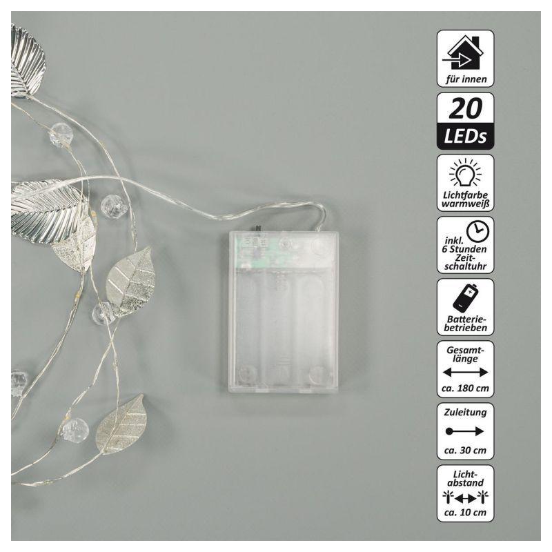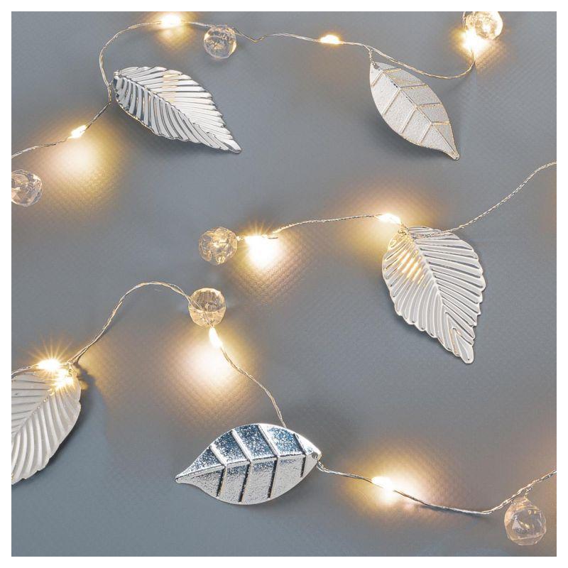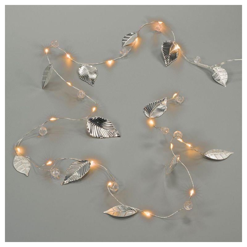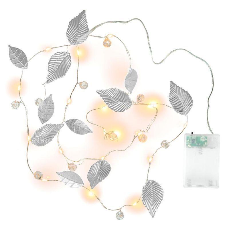 Svítící dekorativní řetěz s perlami a lístky ve stříbrné barvě vhodný pro využití během Vánoc, ale i celého roku. Napájení na 3 tužkové baterie (typ AA). Celkem 20 led diod svítících teple bílou barvou. Celková délka 1,8 m (z toho 1,5 m světelná část a 0,3 m napájecí kabel ke krabičce s bateriemi). Řetěz je určený pouze pro vnitřní použití.