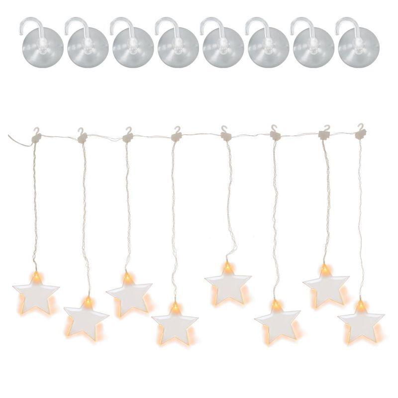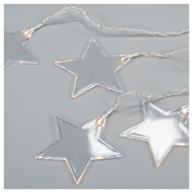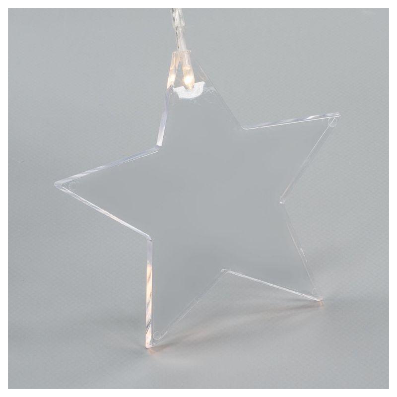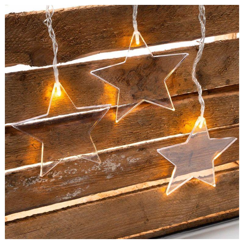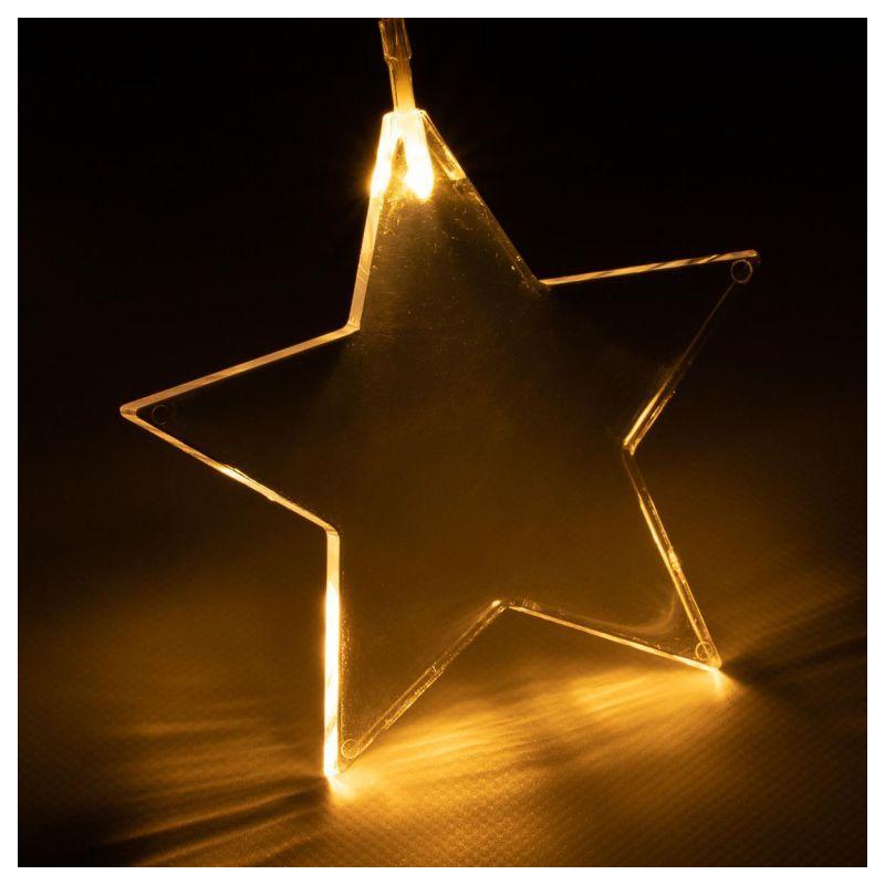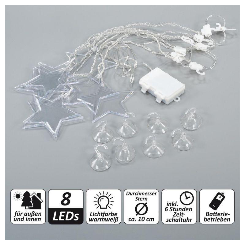 Vánoční světelný závěs s 8 hvězdami ideální pro zavěšení do okna (jednoduché upevnění pomocí přísavek). Napájení bateriemi 3xAA (klasické tužkové). Rozměry 78x40 cm (šířka světelné části x výška), přívodní kabel ke krabičce s bateriemi 1,55 m. Osvětlení svítí teple bílou barvou. Je vhodné i pro venkovní použití (voděodolné provedení s krytím IP44).
