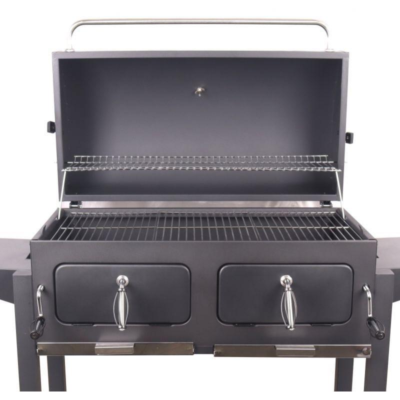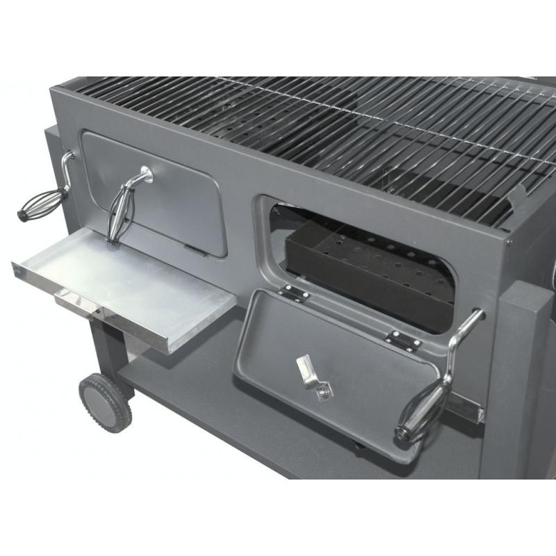 Vysoce kvalitní, bytelný gril na dřevo / dřevěné uhlí se dvěma oddělenými topeništi umožňující současnou přípravu různých pokrmů. Topeniště mají nastavitelnou výšku, kterou lze regulovat samostatně pomocí klik na přední části grilu. Vhodný jak pro zahradní grilovačky, tak i pořádání nejrůznějších akcí soukromého i komerčního charakteru. Rozměry 162x108,5x64 cm, hmotnost 39,7 kg.