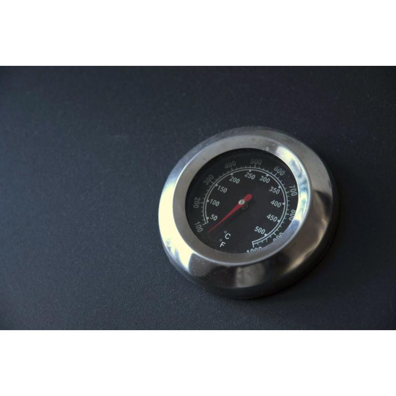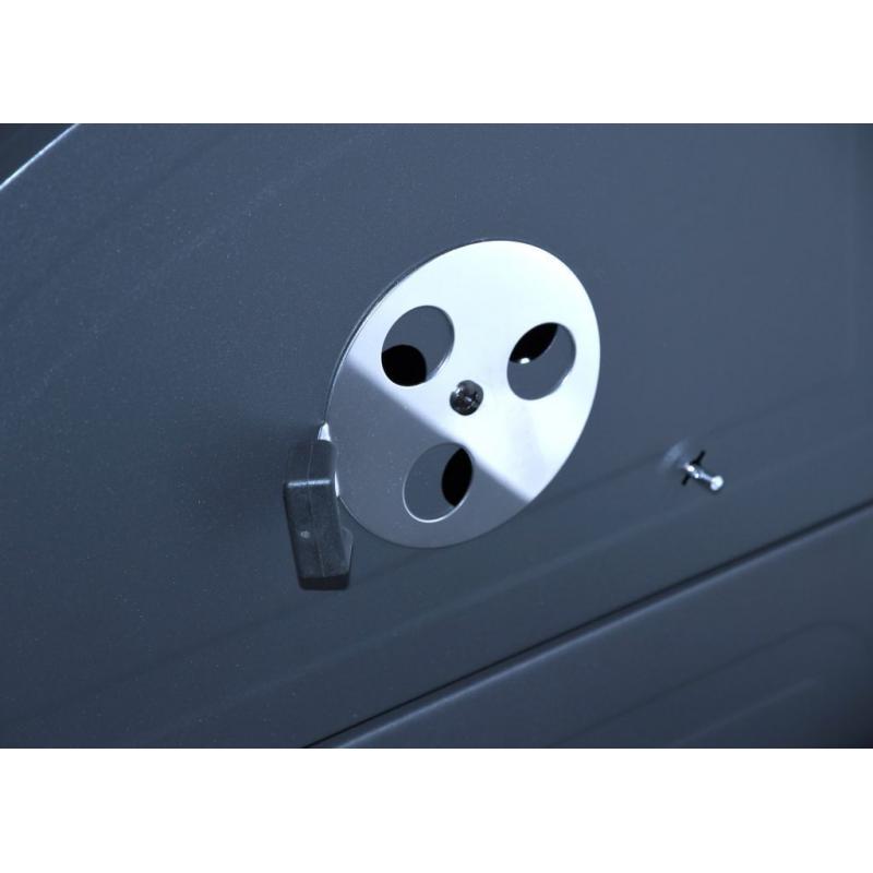 Vyklápěcí víko je opatřené regulovatelným odvodem vzduchu a teploměrem pro kontrolu teploty uvnitř grilu.