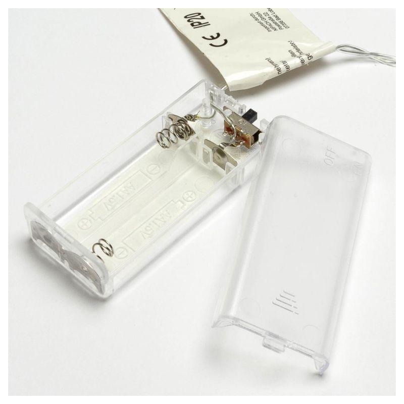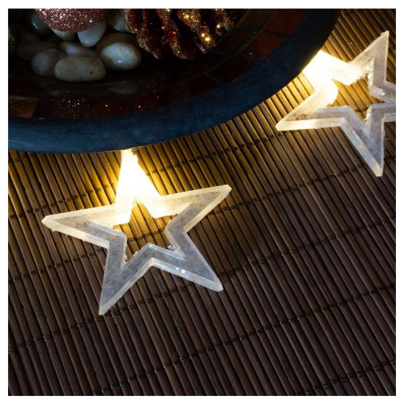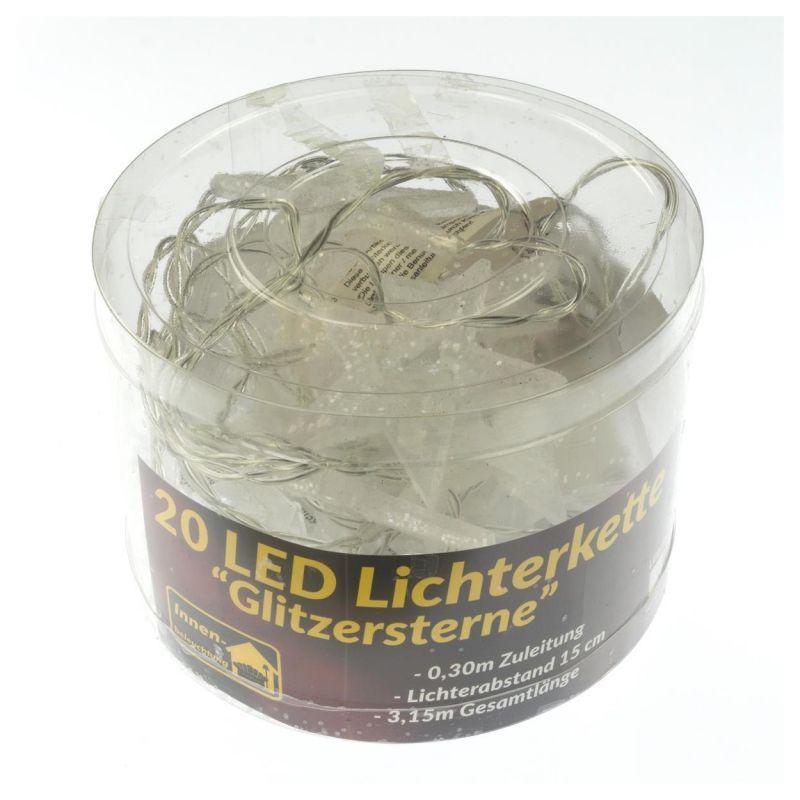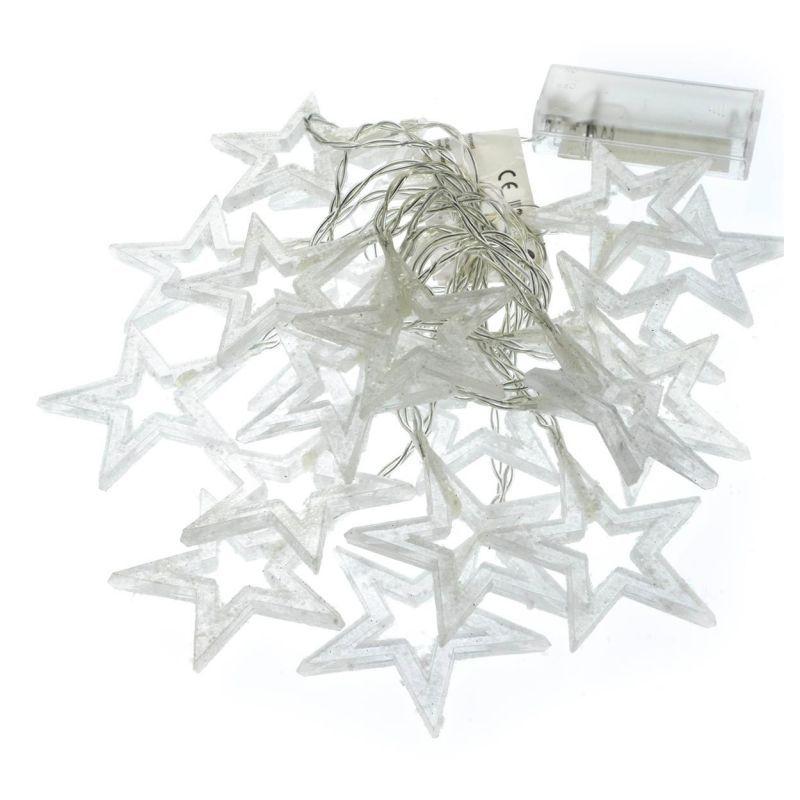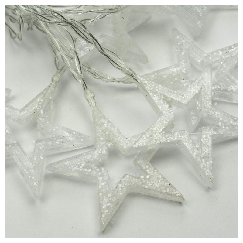 Sada 2 vánočních svítících řetězů s motivem hvězd určených pro vnitřní použití (nejsou voděodolné). Napájení na 2 baterie AA (klasické tužkové). Svítí teple bílým (nažloutlým) světlem. Celková délka 3,15 m (z toho 2,85 m délka světelné části a 0,3 m délka napájecího kabelu ke krabičce s bateriemi). Bez blikající funkce- řetěz trvale svítí.