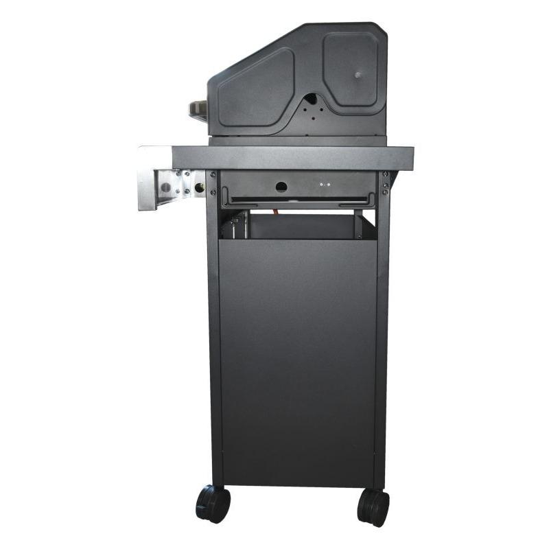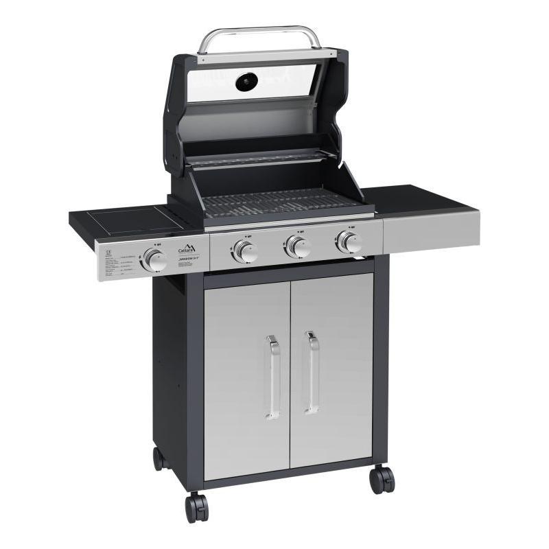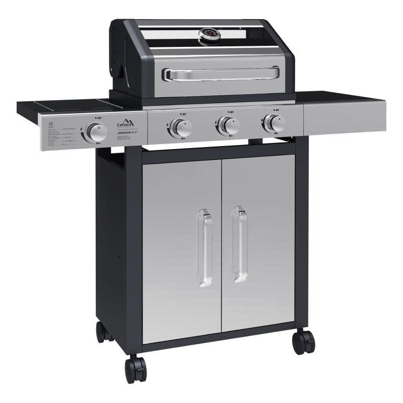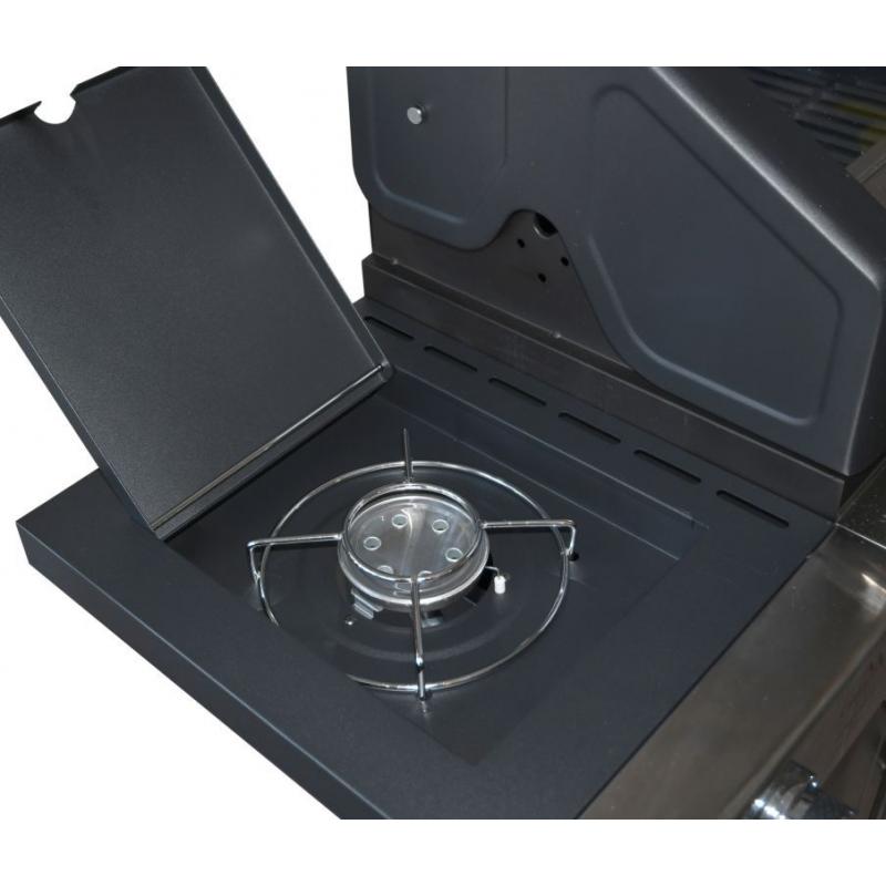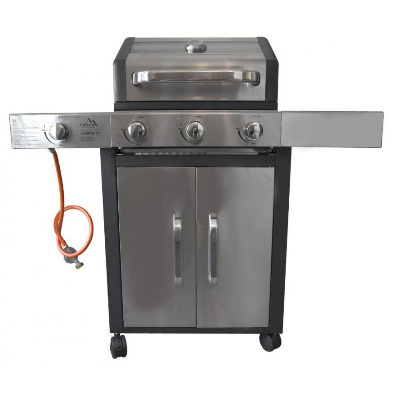 Větší plynový zahradní gril v kombinaci nerezu a černé barvy s uzaviratelným poklopem a plynule regulovatelnými hořáky- třemi hlavními a jedním bočním, který funguje jako klasická plotýnka na vaření. Hořáky mají piezo zapalování (stisknutím tlačítka) a plynulou regulaci hoření.