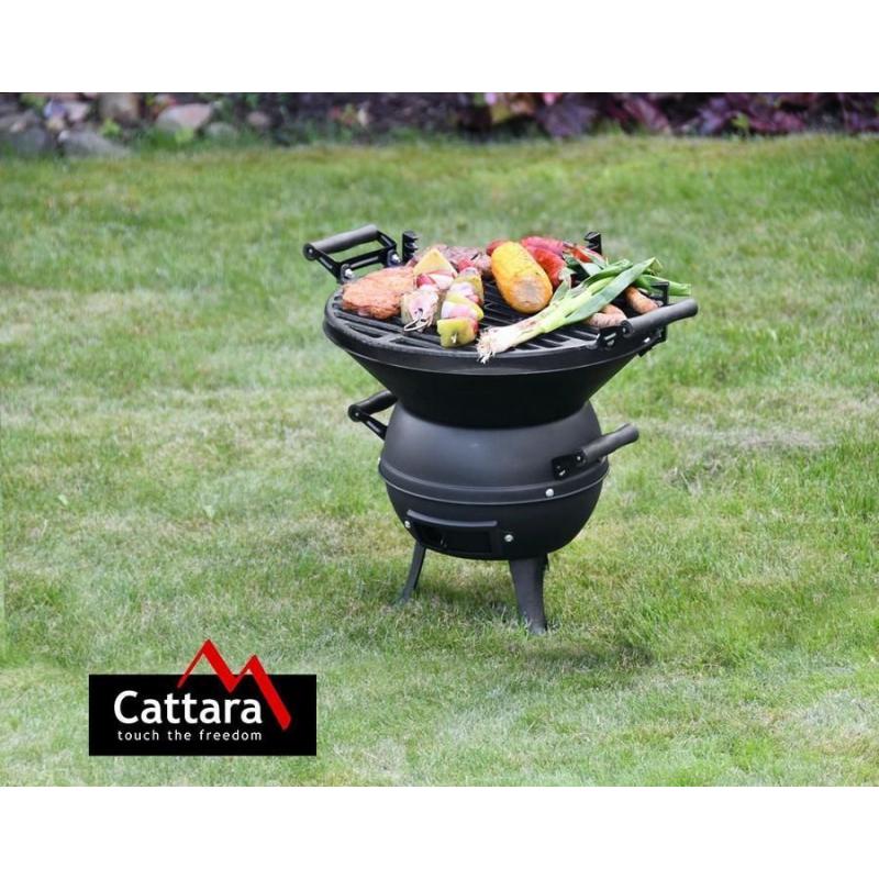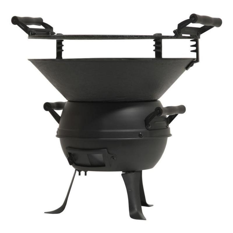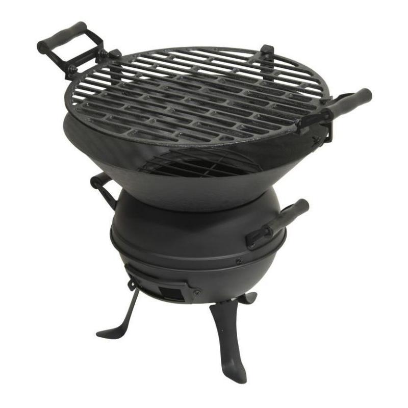 Menší gril na dřevěné uhlí vyrobený z kvalitní litiny o rozměrech 48x37x36 cm (průměr grilovacího prostoru 35 cm).