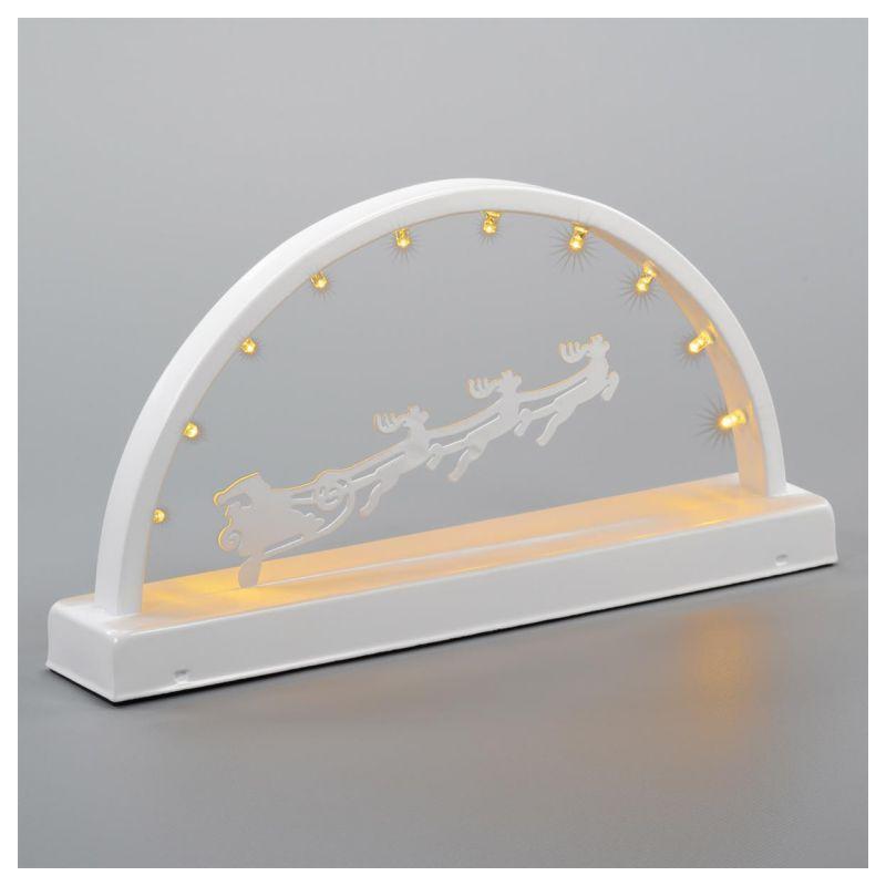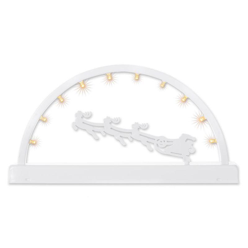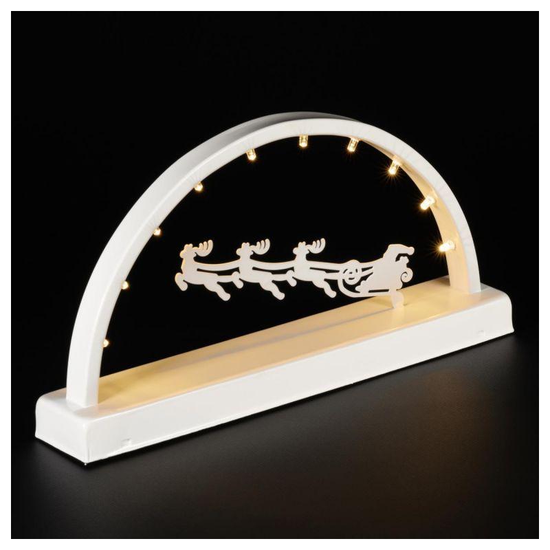 Vánoční led svítící ozdoba- kovový oblouk se Santa Calusem a soby, který je osvětlený 10 led diodami napájenými na baterie (2x AA - klasické tužkové). Rozměry dekorace jsou 31,5x5,8x16 cm. Osvětlení svítí teple bílou barvou.