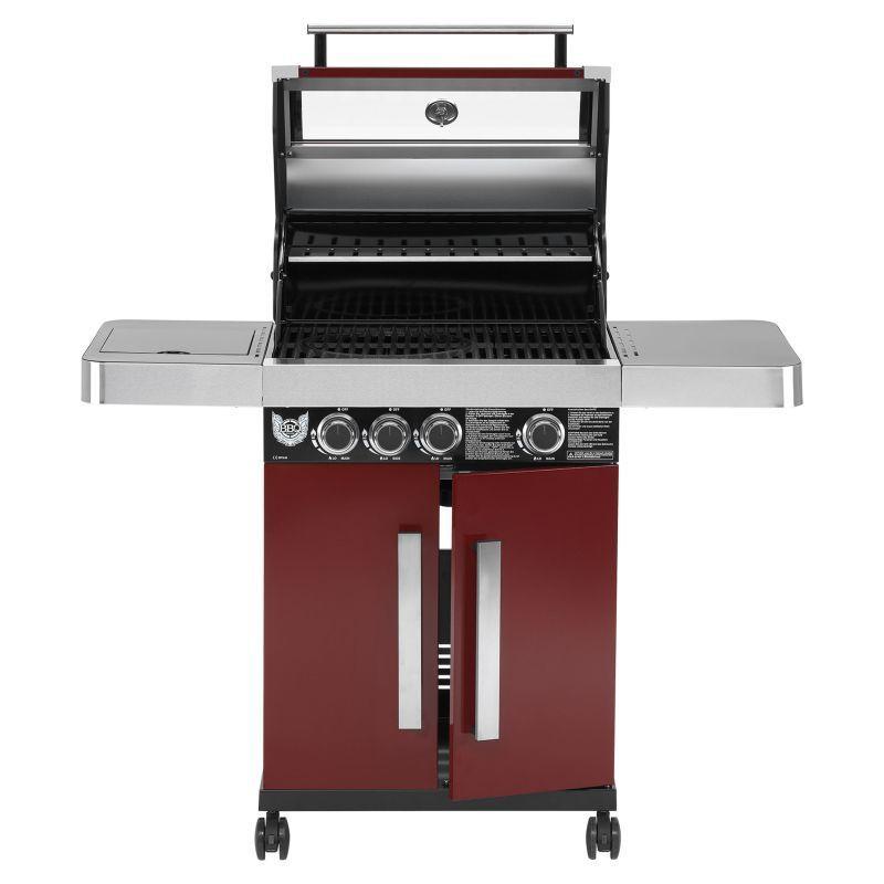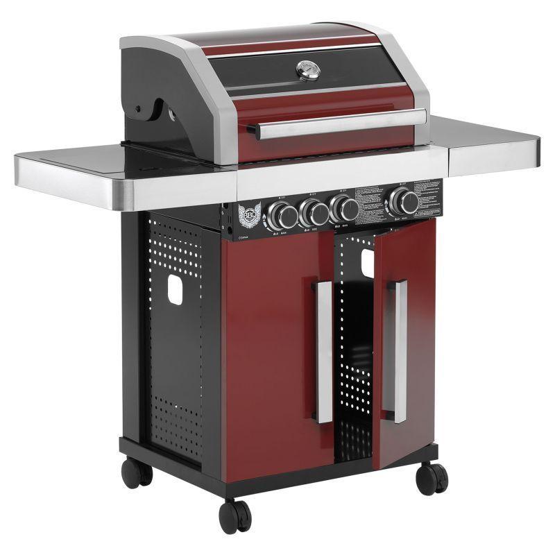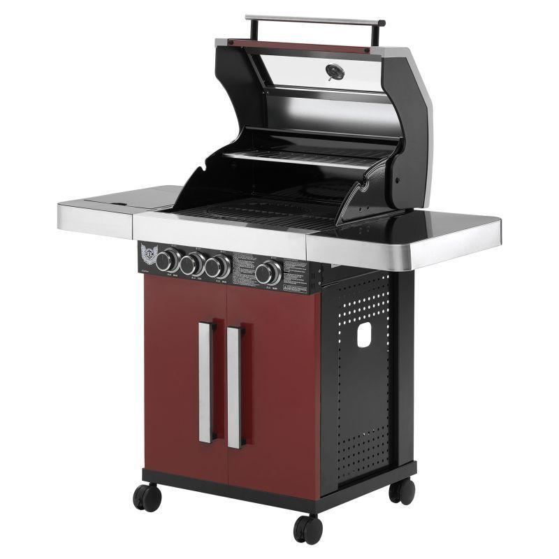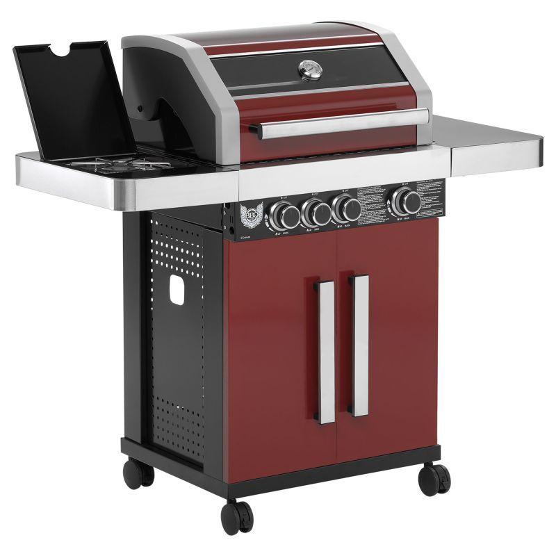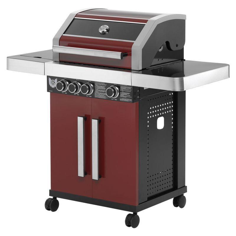 Rodinný zahradní plynový gril s celkem 4 hořáky včetně jednoho bočního, který funguje jako klasická plotýnka. Kvalitní provedení z nerezu v kombinaci stříbrné, černé barvy a tmavě červené barvy o rozměrech 127x118x60 cm (šířka x výška x hloubka).