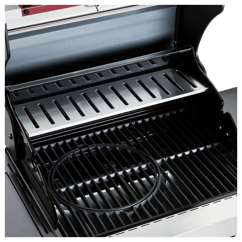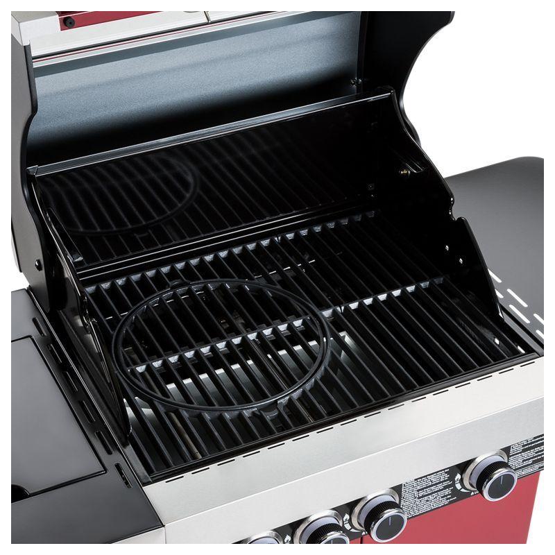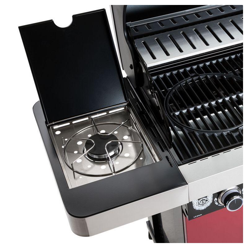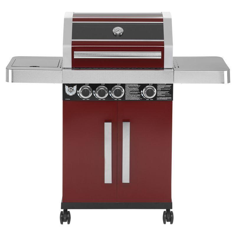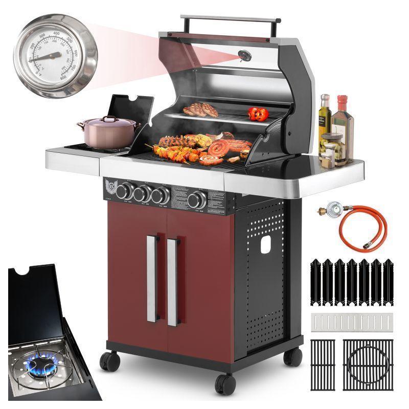 Rodinný zahradní plynový gril s celkem 4 hořáky včetně jednoho bočního, který funguje jako klasická plotýnka. Kvalitní provedení z nerezu v kombinaci stříbrné, černé barvy a tmavě červené barvy o rozměrech 127x118x60 cm (šířka x výška x hloubka).