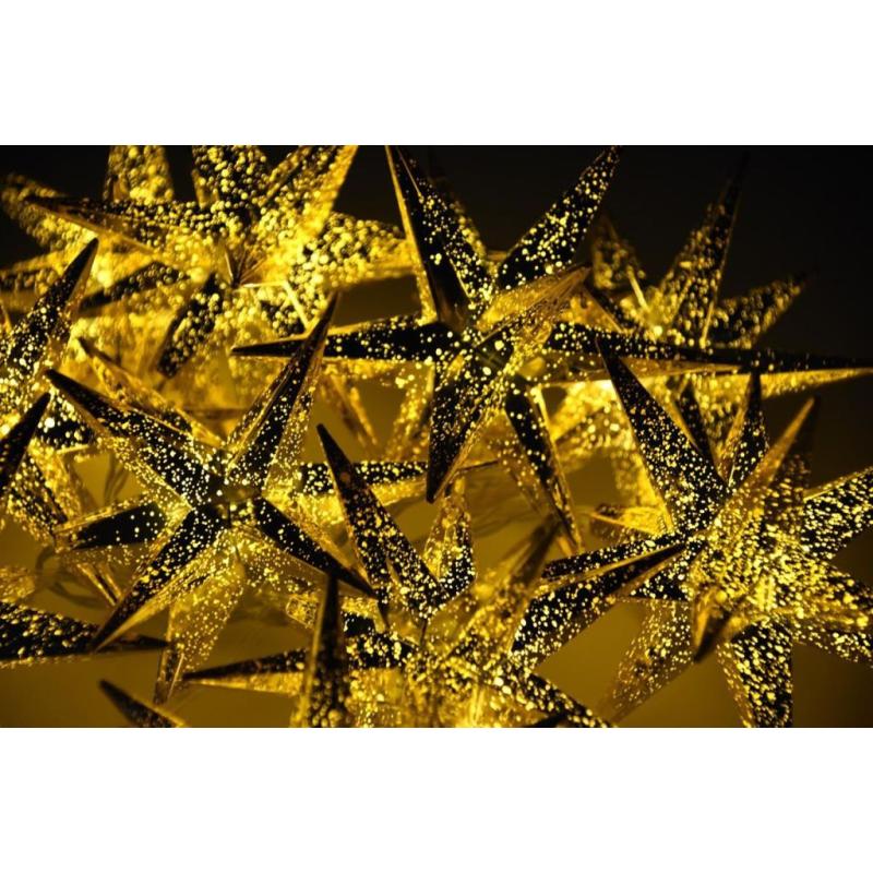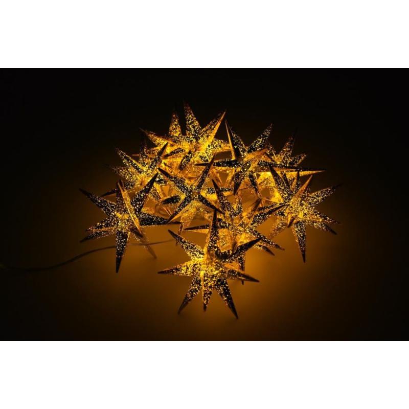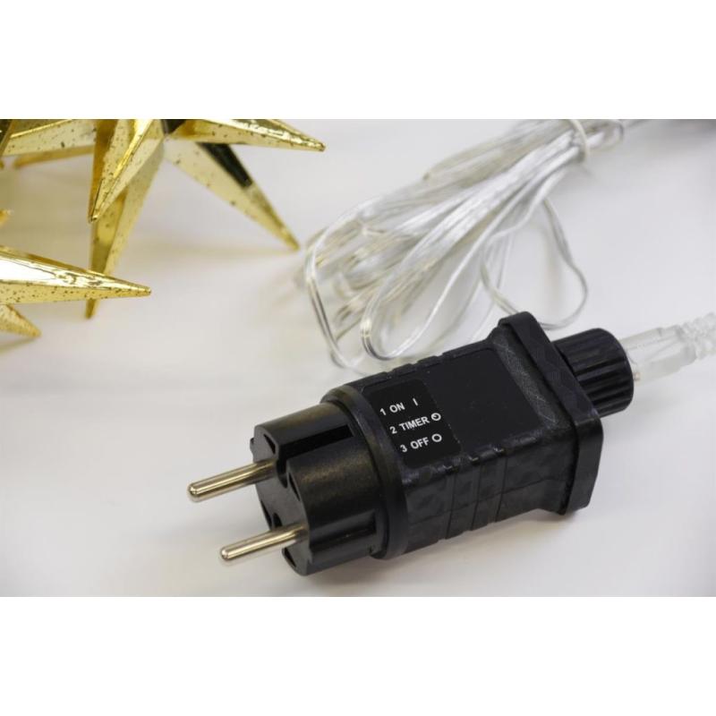 Dekorativní světelný řetěz se zlatými hvězdami, který je vhodný pro vnitřní i venkovní použití. Napájení z klasické elektrické zásuvky 230V. Je vybavený časovačem. Celková délka 6,35 m (z toho 5 m napájecí kabel a 1,35 m světelná část).
