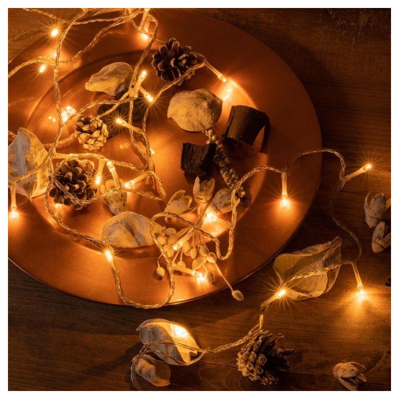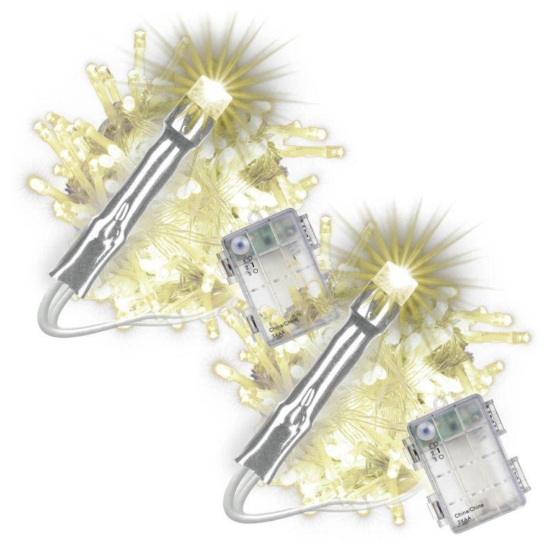 Sada 2 kusů svítících vánočních řetězů pro vnitřní i venkovní použití (krytí IP 44) v moderním provedení s teple bílými LED diodami. Napájení na baterie (3xAA- klasické tužkové). Řetězy jsou vybaveny časovačem. Průhledný kabel. Délka 10m.