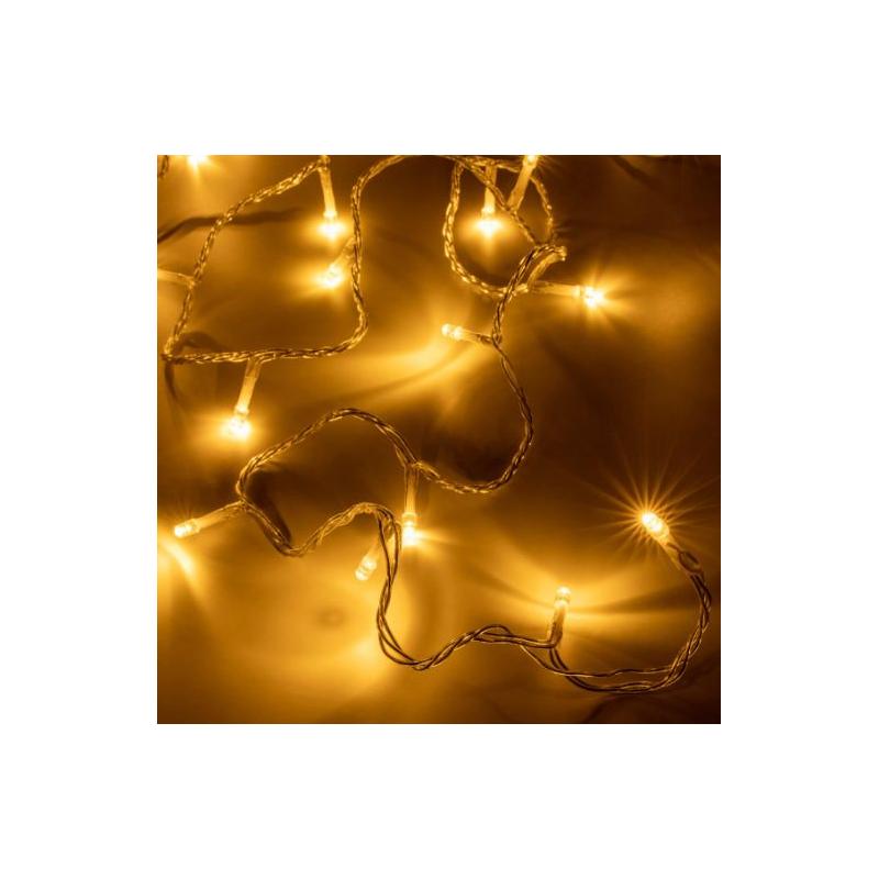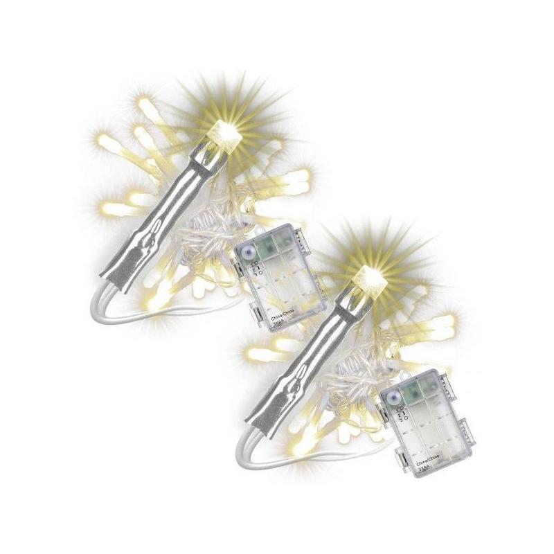 Sada 2 kusů svítících vánočních řetězů pro vnitřní i venkovní použití (krytí IP 44) v moderním provedení s teple bílými LED diodami. Napájení na baterie (3xAA – klasické tužkové). Řetězy jsou vybaveny časovačem. Průhledný kabel. Délka 5 m.